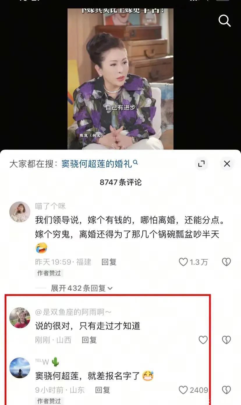 虽然未直接点名,但向太点赞了网友猜测是窦骁与何超莲的评论,让这对夫妻迅速成为舆论焦点。向太借此输出了一套“上嫁优于下嫁”的婚恋观,认为女性下嫁既要照顾男方自尊又要辛苦赚钱,而上嫁哪怕离婚还能分到财产。